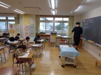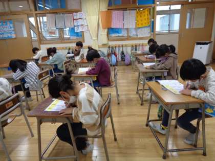 1年生は漢字練習です。姿勢に気をつけながら、丁寧に書いています。