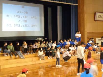 今日のロングわくわくタイムは、運動健康委員会が企画したドッヂボール集会で楽しみました。1年生と6年生、2年生と5年生、3年生と4年生の合同チームが赤団と青団に分かれて対戦しました。どのチームも助け合いながら、笑顔いっぱいの時間となりました。