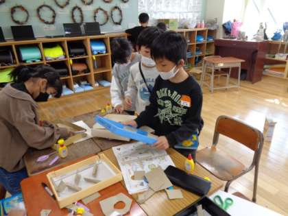 先日から、「見つけたあきであそぼう」の学習がスタートしており、今日から、自分で作りたい物を作り始めました。