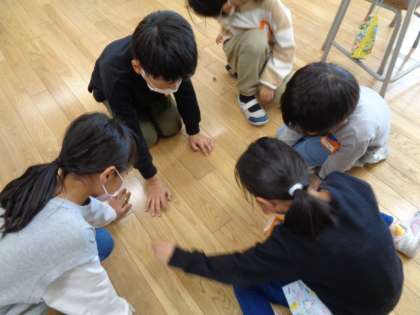 子供たちは、どんぐりごま、どんぐりころころ、まつぼっくりのまと入れ、葉っぱのこすり絵、まつぼっくりのけん玉などに取り組み、友達と関わり合いながら、一生懸命作っていました。そして、できあがった作品を使って友達と一緒に楽しく遊んでいました。来週の活動も楽しみにしている様子です。