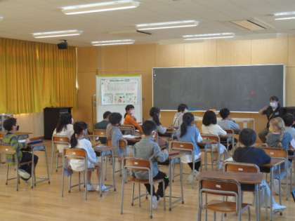 3年生は話し合い。先生の話に耳を傾け、考えていました。