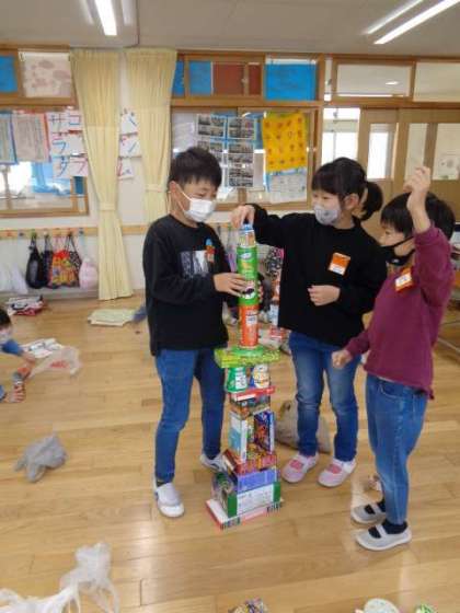 最初の時間は、グループの友達と一緒に、空き箱や空き缶を積んだり重ねたりして、タワーや滑り台、ロボットなど、作りたい物を決めて作りました。