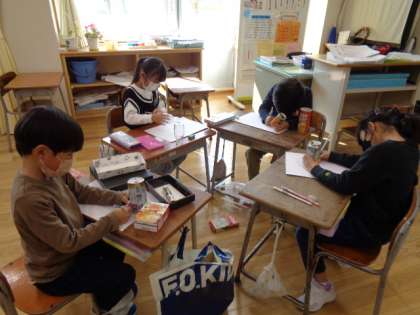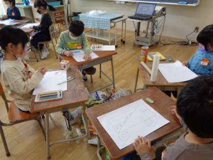 身の回りの物と同じ形の箱や缶の面を見つけ、それを生かして絵を描きました。