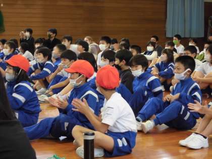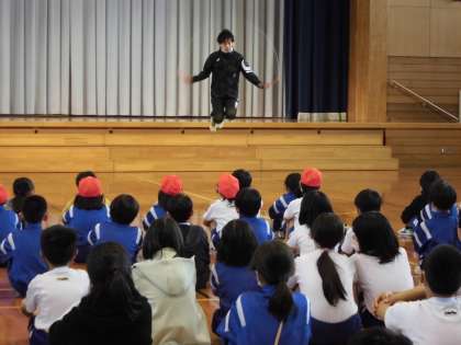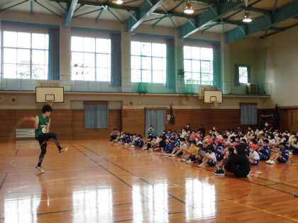生山ヒジキ先生に来ていただき、まずは全校児童が短縄パフォーマンスを鑑賞しました。音楽とともにすごい技が次から次へと繰り出され子供たちも驚き歓声を上げていました。お話もとても楽しくて子供たちの笑顔があふれていました。