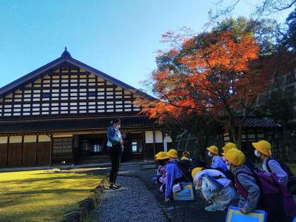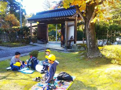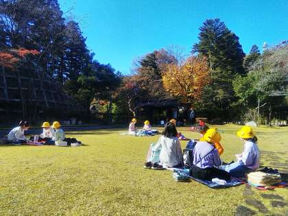まずはお弁当タイムです。青空の下、十分に換気されている環境で、お弁当を広げて楽しく食べます。みんな元気です。