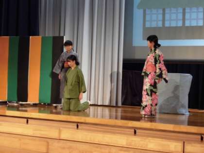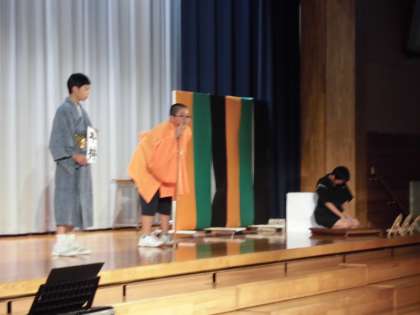 落語「寿限無」と「平林」です。縁起がいいとつけた長い名前をいちいち呼びかける姿に笑いいっぱい。また、覚えが悪く、漢字が読めないためにだんだんとおかしなことになっていく話に、笑い続けました。6年生の発表に引き込まれました。
