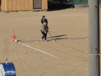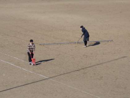 給食後のわくわくタイムに行う予定の50m走記録会に向けて、午前中、用務員と担任以外の先生たちでライン引きなどの準備をしました。
