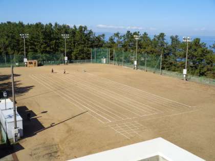 一度に最大12人のタイム測定のために作られるコースはグラウンドいっぱいです。海が見えるグラウンドにまっすぐな線がひかれていきました。