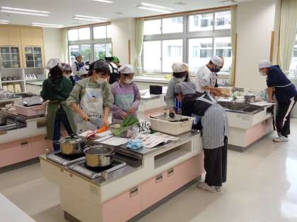 6年生は家庭。調理実習です。協力して作業が進んでいます。