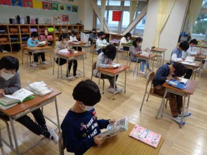 金曜日の朝は、読み聞かせです。今朝は、ボランティアの方々が1年生と2年生にお話をしてくださいました。他の学年も静かに読書をして、落ち着いた朝を過ごしています。