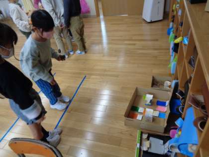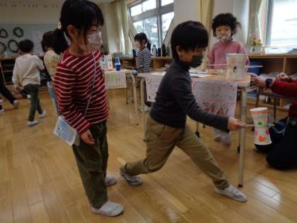 自分たちで作った遊び道具でお店を開いています。元気に挨拶を交わしたり、応援したりして楽しく遊びながら学んでいます。
