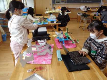 5年生は図工。「立ち上がれワイヤーアート」作品をGoogleクラスルームで発表です。
