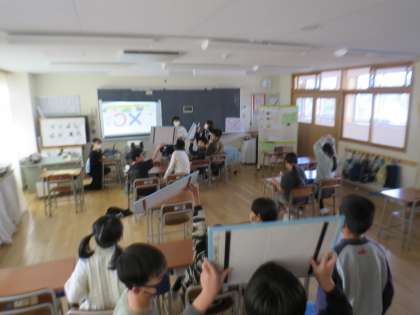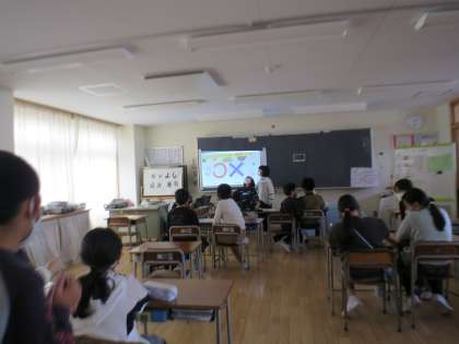 係活動の一環でイベントを行いました。なぞとき係がつくってくれたクリスマスについての○×クイズでは、「日本でクリスマスが始まったのは、室町時代(約500年前)からである」「クリスマスでよく見る緑色には、永遠という意味がある」などの問題が出されました。答えが合っていても間違っていても盛り上がり、楽しい時間を過ごすことができました。