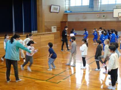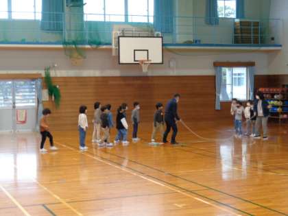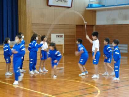 2限後ののびのびタイム。体育館では、1年生、3年生、4年生が8の字跳びの練習をしていました。みんなでかけ声をかけて元気に次々と跳んでいました。