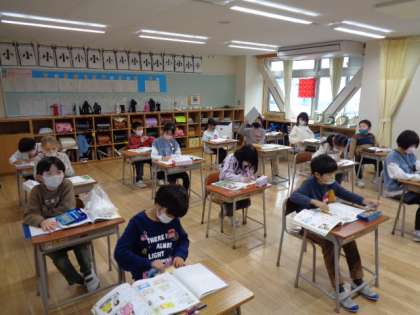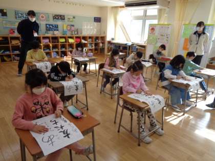 2年生は書写。書き初め練習が始まりました。学びのアシストの先生も加わっています。