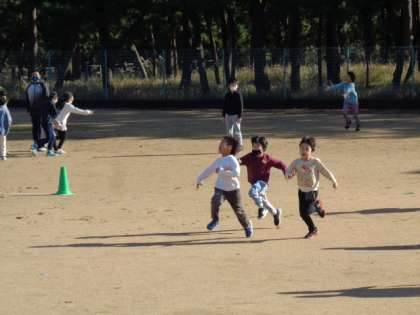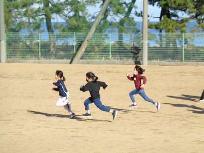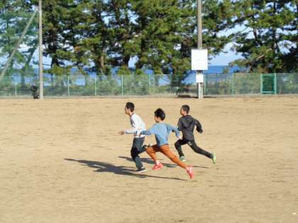 2限後ののびのびタイム。天気がよくてグラウンド状態が良好な場合は、冬でも走ります。はまっ子たちが元気に走り抜けていきます。