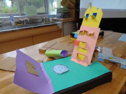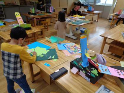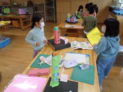 紙の折り方や土台への取り付け方を工夫することで、真っ直ぐな建物が出来上がってきています。また、はさみとカッターナイフを丁寧に使い、切り込みを入れることで、建物に素敵な窓も取り付けられています。