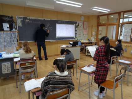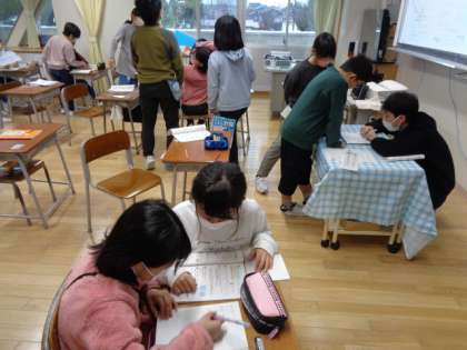 4年生は算数。分数の学習です。先生に聞いたり教え合ったりしてがんばっています。