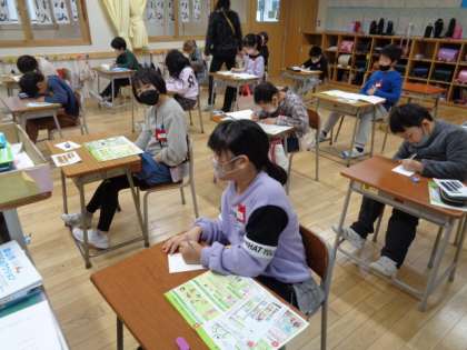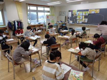 1年生は道徳。「はしの上のおおかみ」おおかみはどう思っているか考えています。
