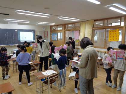1年生は国語。学びのアシスト、スクールサポーターの先生も入って、子供たちの書いた文章を読み合っています。