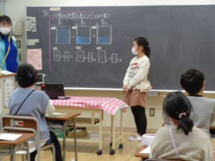 3年生は算数。分数の計算です。どうやって計算するか考えています。