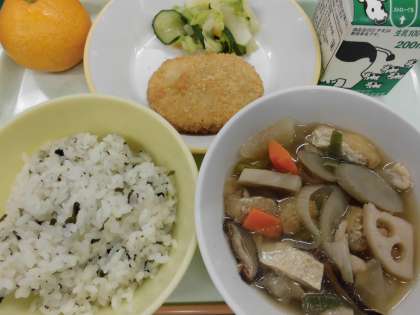 今日の給食はカボチャや柚が使われ、数日早いですが冬至を意識した給食でした。カボチャのコロッケが甘くてサクサクでおいしかったです。