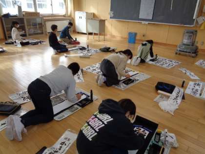 6年生は書き初め練習。「強い決意」を力強くかいています。