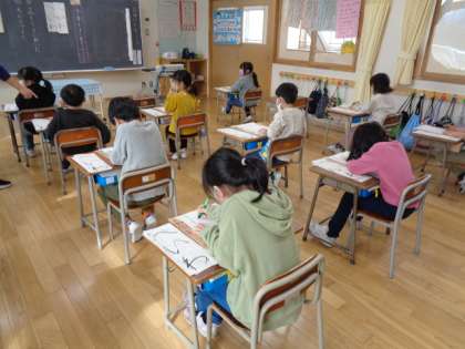 1年生は書き初め練習です。一画ずつ丁寧に書いています。