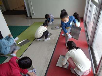 机を教室の外に出し、床やロッカーの中をがきれいになるまで水拭きをしました。また、下駄箱の砂受け皿もピカピカにしました。
