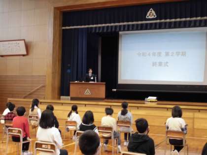 2学期の終業式を行いました。「校長先生のお話」や1・3年生の児童が2学期に成長したことの発表を聴き、校歌を歌いました。