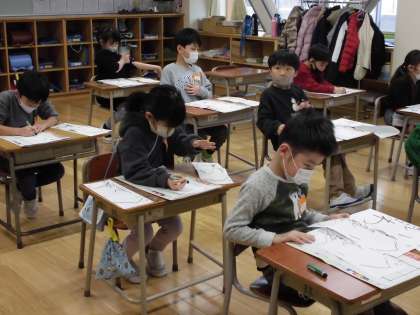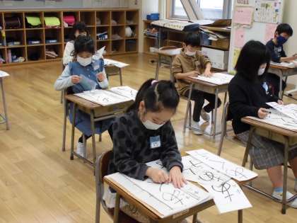 始業式後、書き初め大会を行いました。1・2年生は教室で行います。1年生は「へいわ」2年生は「あく手」です。姿勢よく椅子に座り、丁寧に仕上げました。