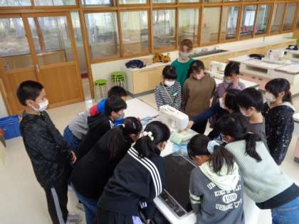 5年生は家庭。ミシンぬいです。先生の手本を見ようと集まっていました。