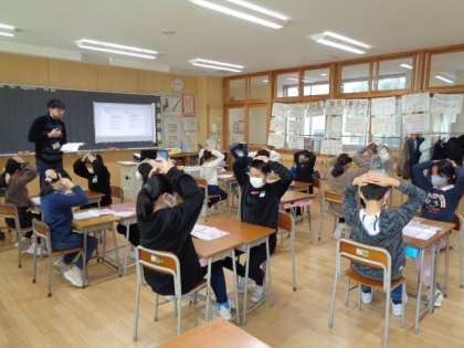 5年生は外国語。担任の後に続いて発音練習です。ある言葉を言うと机上の消しゴムを取ることになっています。