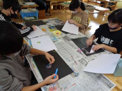 6年生は図工。黒画用紙にチョークを使って模様を描いています。