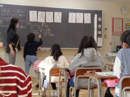 3年生は理科。豆電球と電池のつなぎ方について説明しています。