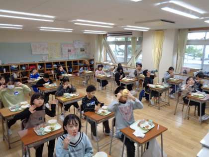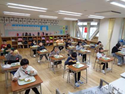 3、4年生の給食風景です。適度な会話を楽しみながら、おいしく食べています。