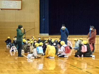 給食後すぐに5限目の授業を開始することで下校時刻を早めました。14時15分に体育館に集合。登校班ごとに、担当の先生と確認して集団で下校しました。