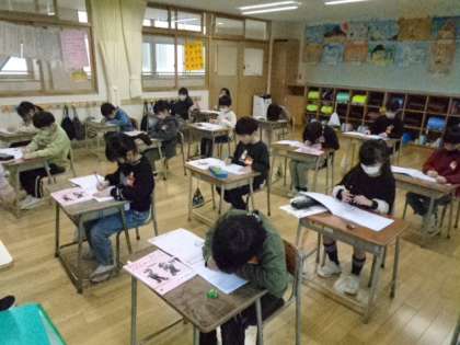 1年生は漢字練習。姿勢に気をつけて丁寧に書いています。