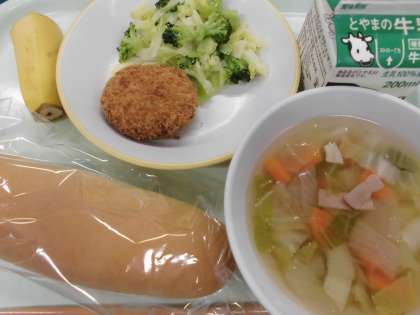 優しい、温かい白菜スープがおいしかったです。ブロッコリーのサラダもドレッシングが効いていてパンによく合っていました。