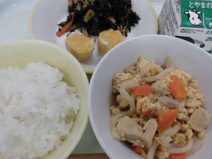 高野豆腐の卵とじは、ふんわりした卵と噛みごたえのある高野豆腐が一緒に味わえたいへんおいしかったです。ヒジキの炒め煮も見た目は、手強そうですが、よいお味でした。