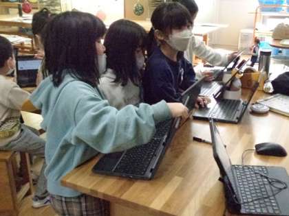 2年生は図工。自作の絵本を紹介するスライドを作っています。