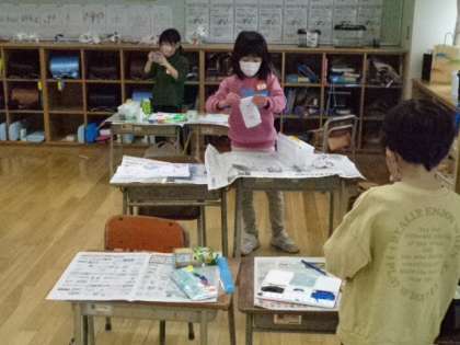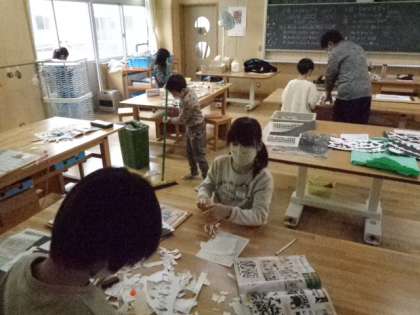 2年生は図工。切った紙を置いてみると、何が見えるかな・・・