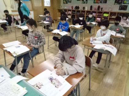 3年生は道徳。「お母さん、かぜでねこむ」ちびまる子ちゃんです。
