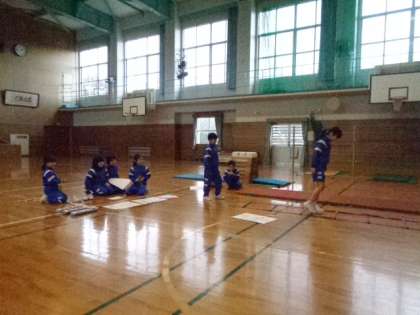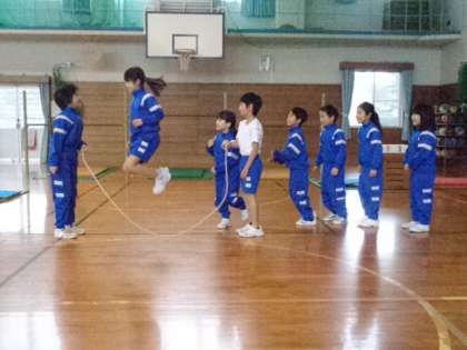 「できるようになったこと はっぴょう会」リハーサルです。なわとびやラダー、マット運動に鉄棒、鍵盤ハーモニカ。九九に跳び箱、そして、大なわ8の字跳びです。決めポーズも考えて、はりきっています。