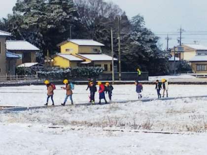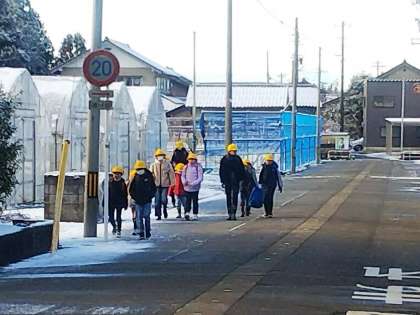 子供たちは、あえて氷の上を歩こうとします。側溝の水面が凍っていることを発見し、歓声を上げます。仲間と歩きながら、様々な発見をしつつ学校にたどり着きます。はまっ子たちは今日もこうして元気に登校しています。