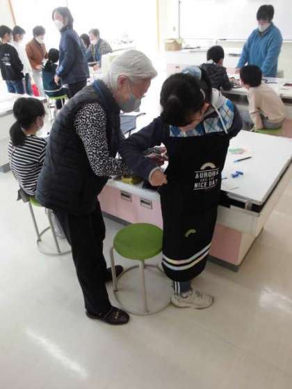 地域の家庭科サポーターの皆様のおかげで、5年生は手作りエプロンを完成させることができました。授業の最後に、子供たちは感謝の手紙を渡し、ありがとうの気持ちを伝えました。家庭科サポーターの皆様、ありがとうございました。