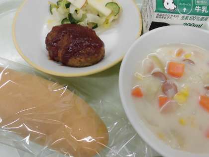 今日は学校給食とやまの日のメニューです。県産の食材がたくさん使われています。リンゴが入ったサラダはシャキシャキといい音がしました。コーンチャウダーのコーンが甘くておいしかったです。