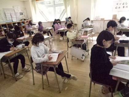 4年生は国語。「初雪のふる日」朗読を聞いています。