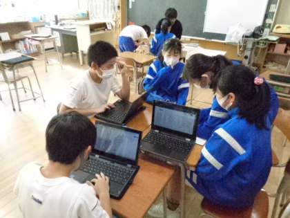5年生はクロムブックを使って何か話し合っています。
