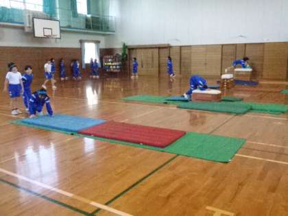 3年生は体育。マット運動や跳び箱の練習中です。